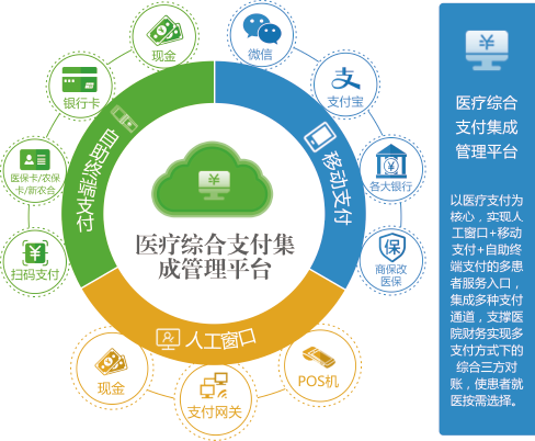 - 打造无现金智慧医院,支持多种支付方式(现金、银联卡、微信支付宝),三种缴费模式(窗口、自助、诊间)同时并存。